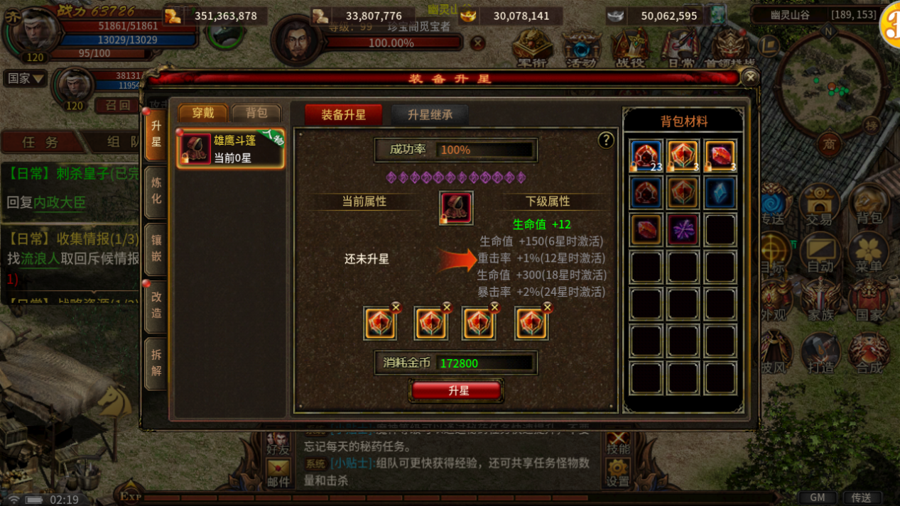1、玩家可以选择暗金装备,并使用升级神石、高级升级神石和斗气石等道具进行升星,从而获得额外的升星属性,如攻击力、生命值、暴击率等的提升。每次升星都需要消耗一定数量的金币。