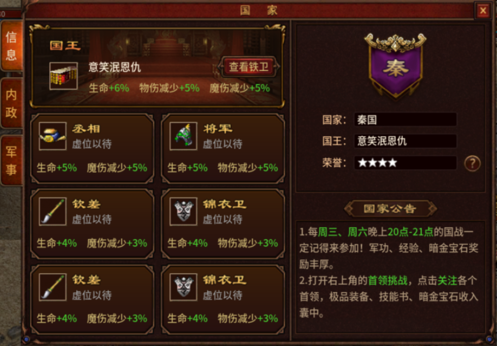 游戏初始时需要选择性别及所属国家,可以自主选择喜欢的国家(秦齐赵),也可随机选择国家(可获得超值大礼包),在不断变强的过程中守护家园防止敌国犯境!