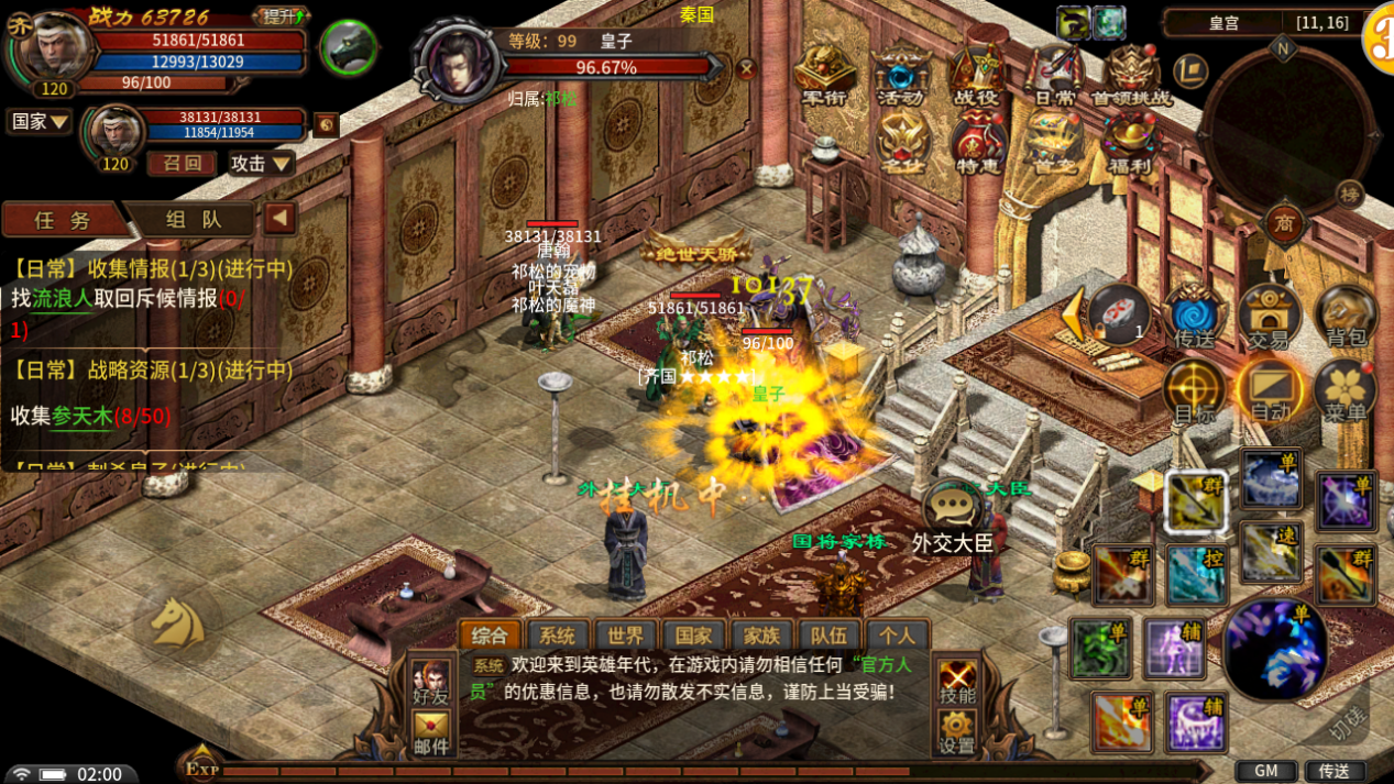 角色60级可领取刺杀皇子任务。前往皇宫找内政大臣接取刺杀皇子任务!接取后去敌国皇宫刺杀敌国的皇子即可完成任务。刺杀皇子为每日任务,每天可接取1次。玩家等级越高,任务奖励越丰富!