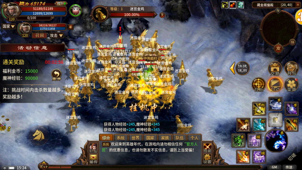 每天的09:00~23:00,前往藏金阁挑战,在挑战时间内消灭怪物越多,获得奖励越多。消灭全部怪物,可获得最高奖励。每3小时可挑战主殿或偏殿其中一个,挑战结束进入挑战倒计时,倒计时结束后可再次挑战。扫荡将获得上次挑战的奖励。