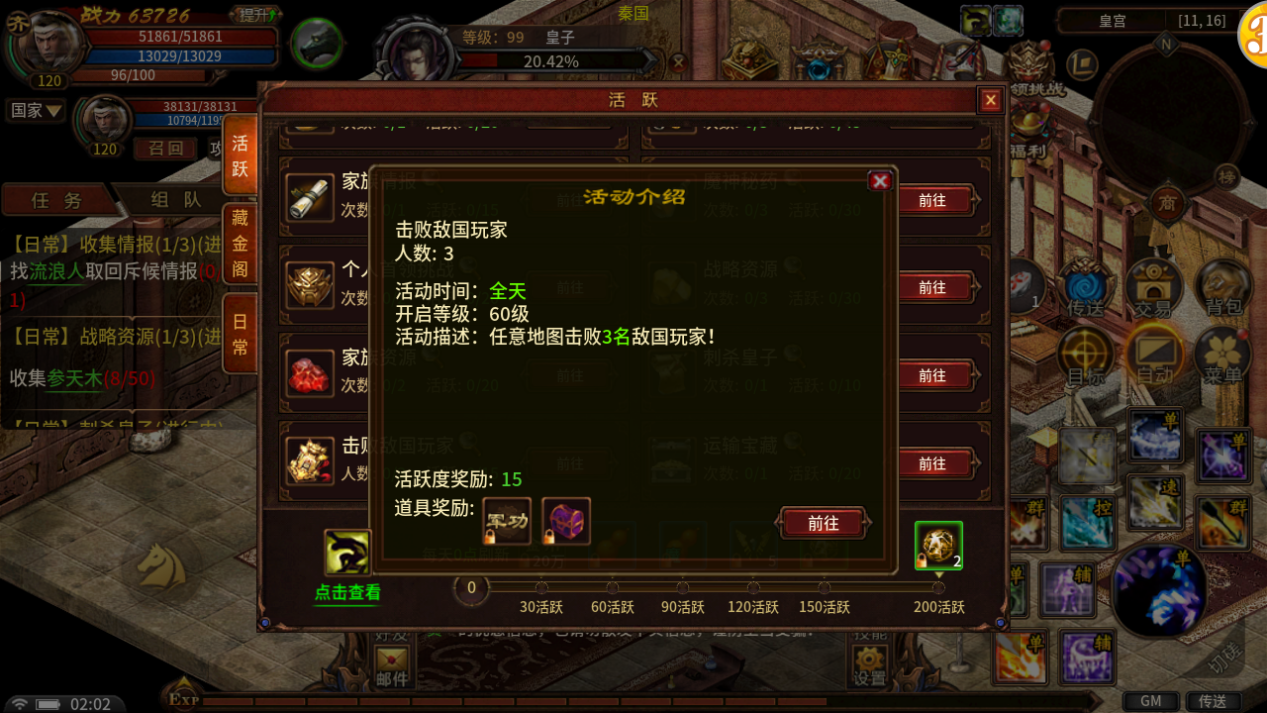 角色60级可领取该任务。任意地图击败3名敌国玩家。完成任务可获得军功、神石宝箱奖励。
